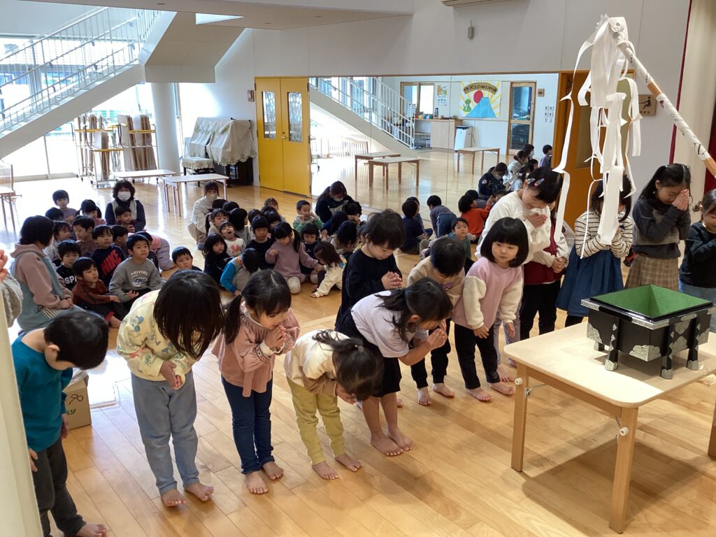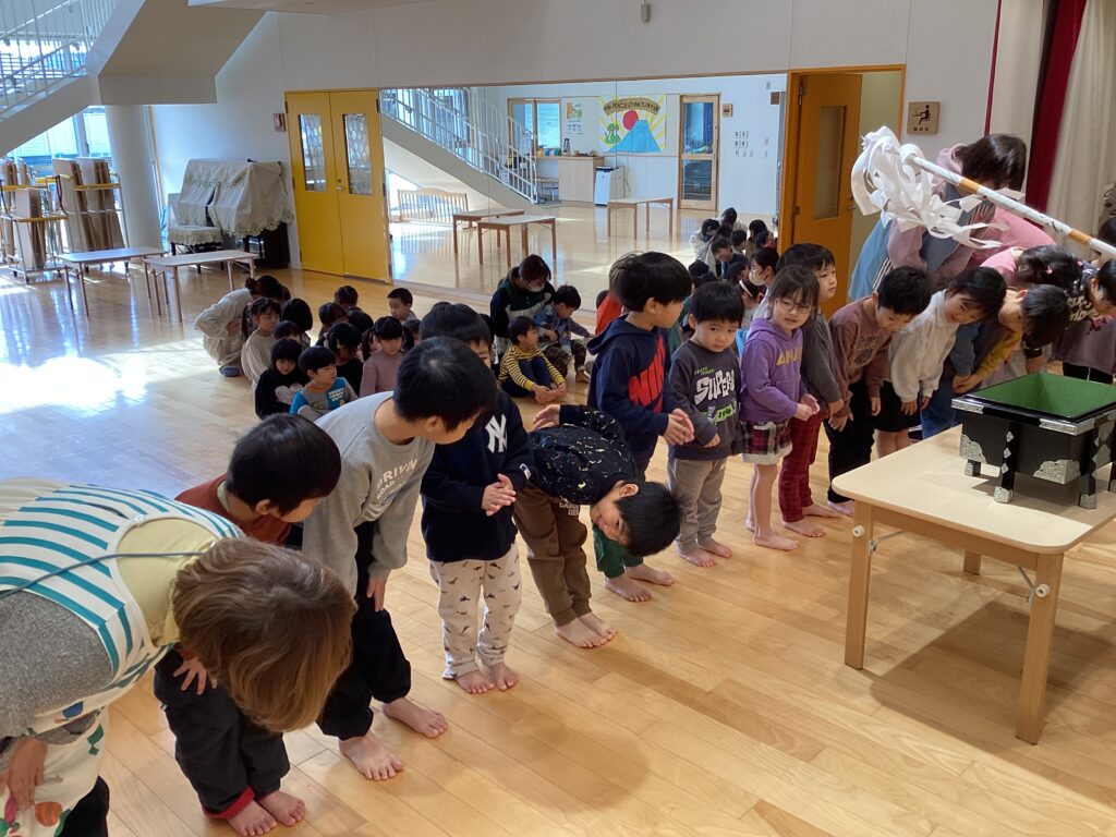 1月14日(火)のわくわくショートタイムでは、お正月ならではの経験をみんなで楽しんでみました。「お賽銭」という言葉も知っていてびっくりでした。ステージに作った「エンゼル神社」にペットボトルのふたのお賽銭をあげて、「二礼二拍手一礼」というちょっと難しい決まり事をみんなでやってみたのですが、まじめな顔で、とても上手にやってくれました。おはらいもしてもらって、初めての経験の子も多く、なんかわくわくと楽しい経験ができました!