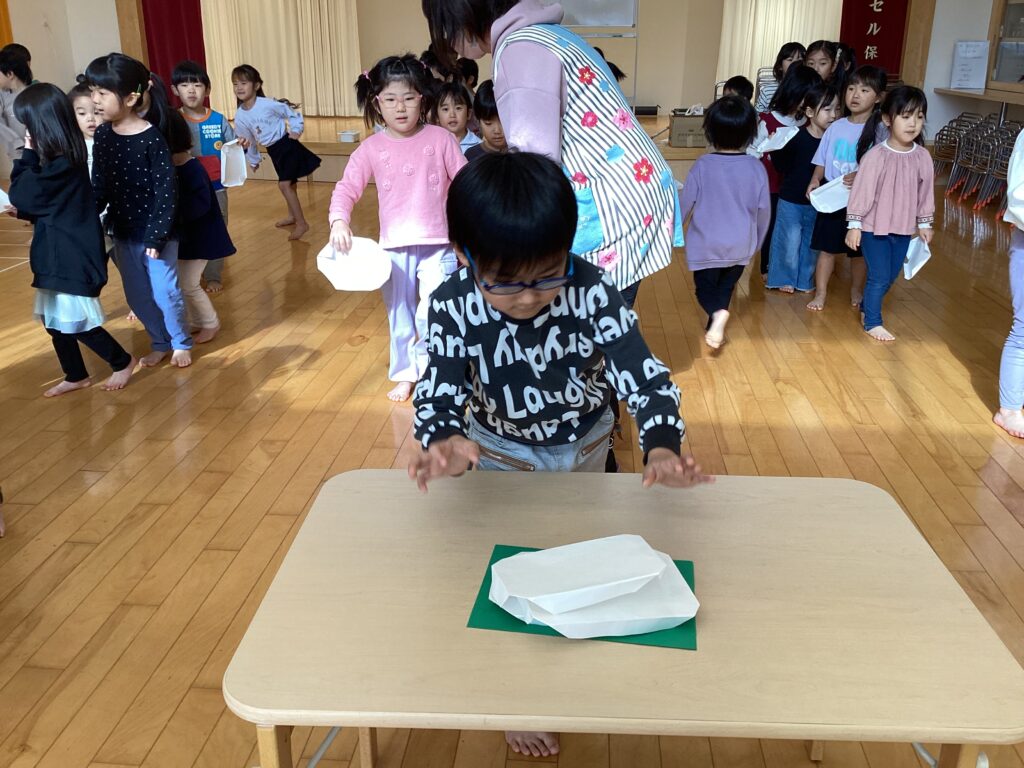 鏡餅リレーは、紙で作った鏡餅をみんなで倒れないように重ねていくゲームで、慎重に頑張ってくれましたよ😊日本の伝統文化に触れた楽しい活動になりました。