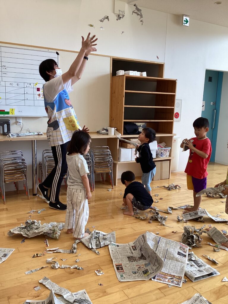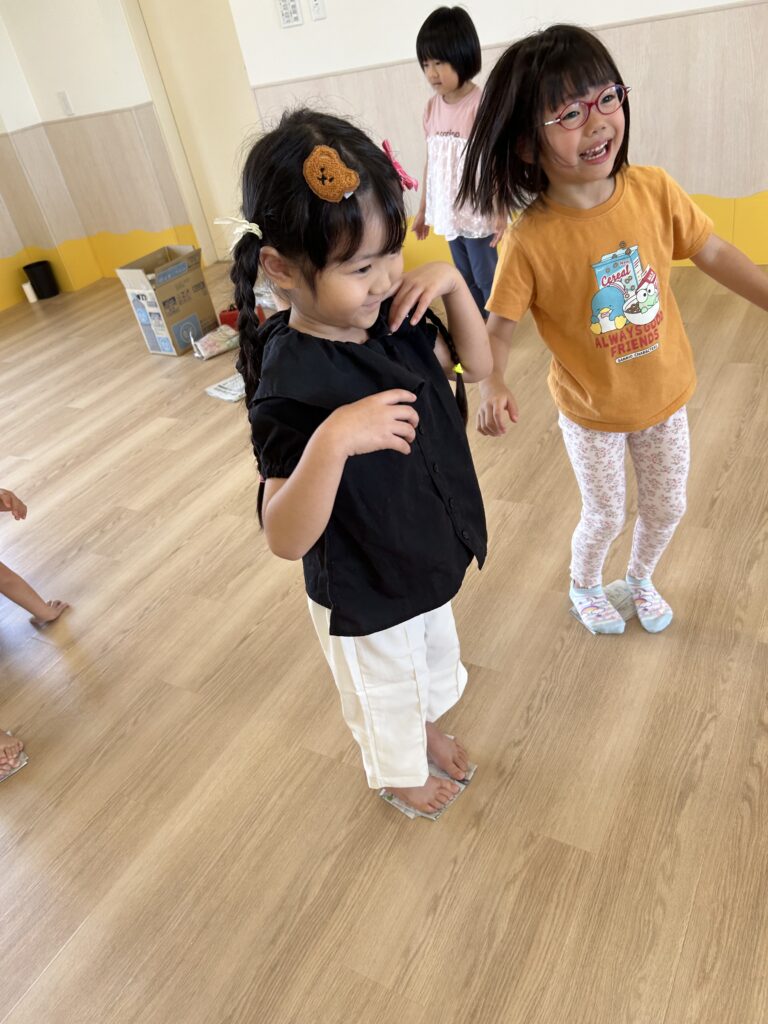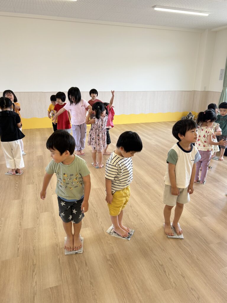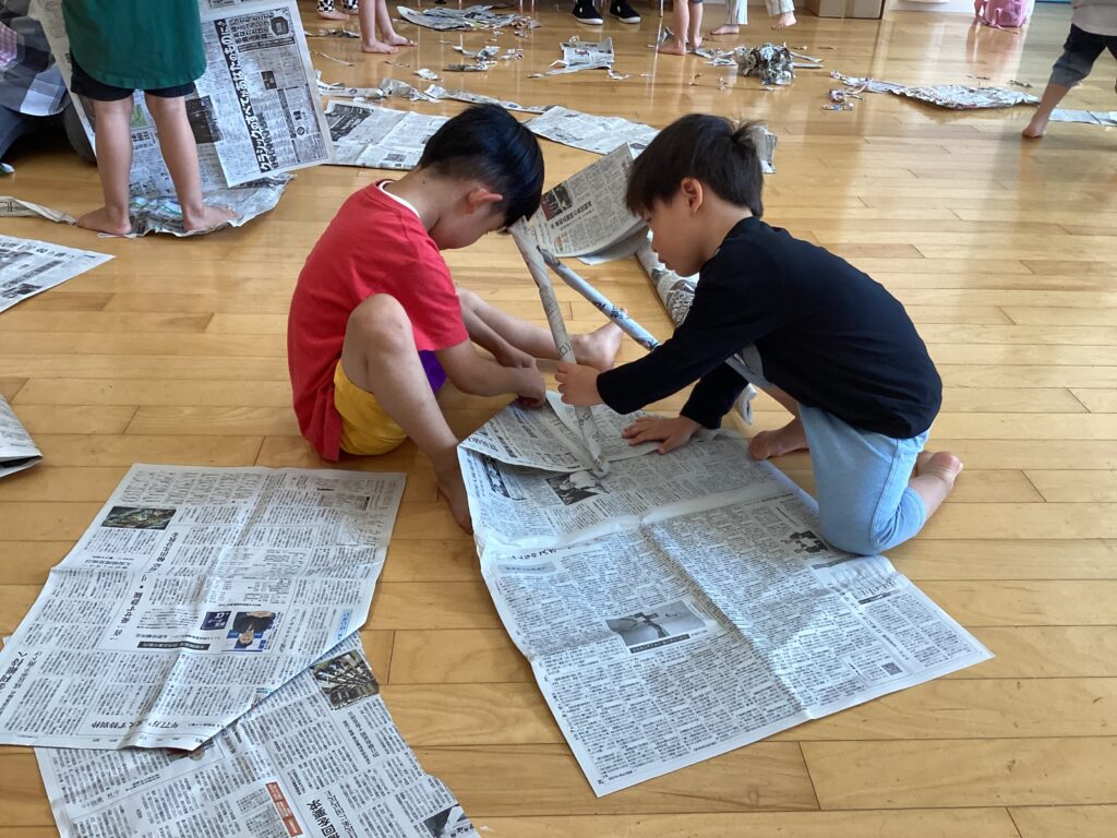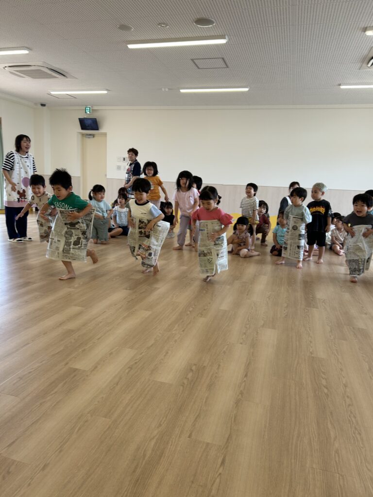 今年度初めてのわくわくタイムは、新聞遊びでした。お腹にあてて風を切って走る「新聞紙リレー」では、コアラさんも真似をしながら楽しそうに走ってくれましたよ✨!折りたたんでいく「落ちないでゲーム」では、小さくなった新聞紙から落ちないように真剣な様子がとても可愛かったです。自由遊びでは、剣を作ったり、お洋服にしたり、パンチで新聞紙を破ったりと、楽しいこと一杯の時間でした💓朝の会など、異年齢児交流の機会も増えているので、小さい子への優しいお世話も行き届いて、クラスに関係なく関わる姿が増えています。次回もお楽しみに😊!!